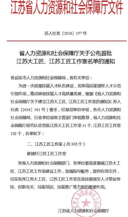 近日,江苏省人力资源和社会保障厅公布了首批江苏大工匠工作室、江苏工匠工作室名单(苏人社发[2018]357号),江苏大工匠/工匠工作室是省人社厅为进一步加强技能人才队伍建设,发挥高技能领军人才示范引领作用,推动我省技能人才高质量发展而设立,本次共认定江苏大工匠工作室11个、江苏工匠工作室102个。我校“江苏工匠”翟靖轩申报的“江苏工匠工作室”通过审核和认定入选了江苏工匠工作室,为我校新增一项省级高技能人才创新和培育平台。