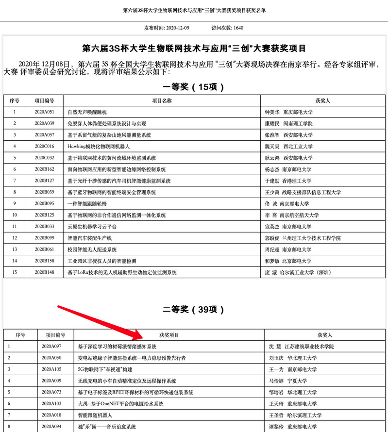 2020年12月7日-11日, 由中国电子学会和中国通信学会主办的第六届3S杯全国大学生物联网技术与应用“三创”大赛决赛在江苏南京市举行。来自全国130多所高校的数千个项目参加了本届比赛。经过资格审查、网络评审、初赛等环节,最终有68个项目进入现场决赛,8位院士莅临现场颁奖。其中我校金沙集团wwW3354CC报送项目进入现场决赛,并获得大赛二等奖第一名,实现我校该项赛事历史突破,也是全国唯一一所获奖的高职院校。
