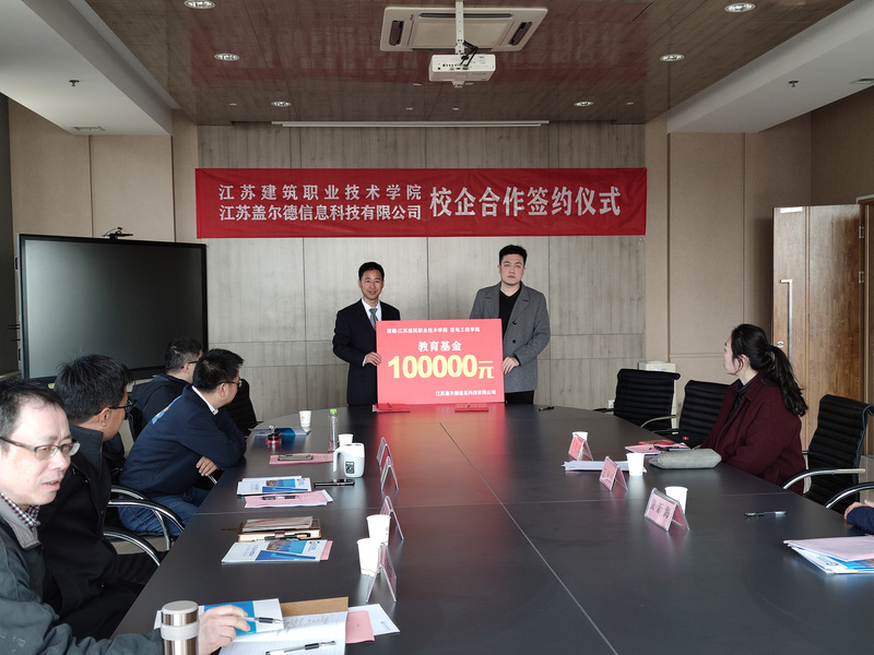 签约仪式上,王泳辰总经理介绍了公司的历史、现状以及将来发展目标,也感谢我校往届毕业生给公司创造的价值,并把我校作为公司第一家的合作高校。娄志刚处长介绍我校的办学历史、办学特色以及校企合作政策。金沙集团wwW3354CC院长吴兆立向王泳辰一行介绍了学院的办学规模、专任教师和专业发展等基本情况。双方针对现代学徒制人才培养模式、人才培养方案开发实施和信息技术应用等方面进行了详细交流与深入探讨。同时,江苏盖尔德信息科技有限公司向我校捐助教育基金人民币十万元。