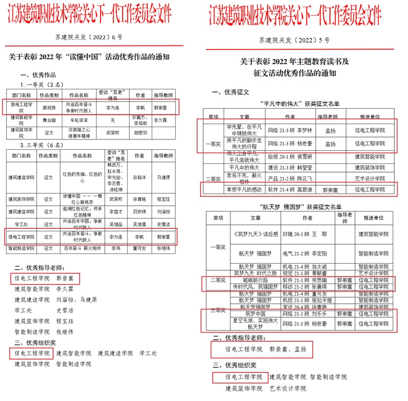 10月5日,我校发布了《关于表彰2022年“读懂中国”活动优秀作品的通知》、《关于表彰2022年主题教育读书及征文活动优秀作品的通知》。在两项活动中,我院师生共获得:一等奖3人次,二等奖3人次,三等奖3人次。两名老师获得优秀指导老师奖,学院获得优秀组织奖。