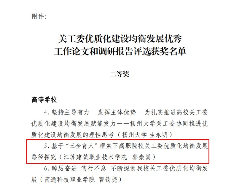 近日,江苏省教育系统关工委公布2022年度关工委优质化建设均衡发展优秀工作论文和调研报告评选结果,我院专职辅导员、二级关工委秘书长郭崇嵩撰写的《基于“三全育人”框架下高职院校关工委优质化均衡发展路径探究》获高校组二等奖,文章探讨了新时代背景下以关工委工作为抓手推进十大育人体系的有效路径,构建了“切入-嵌入-渗入-融入”育人方法。