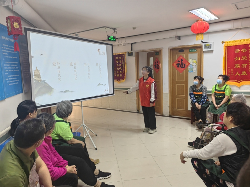 根据任务安排,志愿者分成两个小组,一组负责清洗住房的空调滤网、检查电子设备,一组负责帮助老人收拾屋子、打扫卫生,美化护理院卫生环境。清扫工作结束后,志愿者为老人、护理院工作人员播放了消防安全警示教育片,详细讲解了火灾的危害、防火基本常识、疏散逃生方法等消防知识,叮嘱老人们不要卧床吸烟、不要乱丢烟头,不要超负荷使用电器。开展了《中国现代化建设成就》主题宣讲,向老人讲授了在党的领导下,国家在经济、医疗、科技等方面取得的伟大成就。